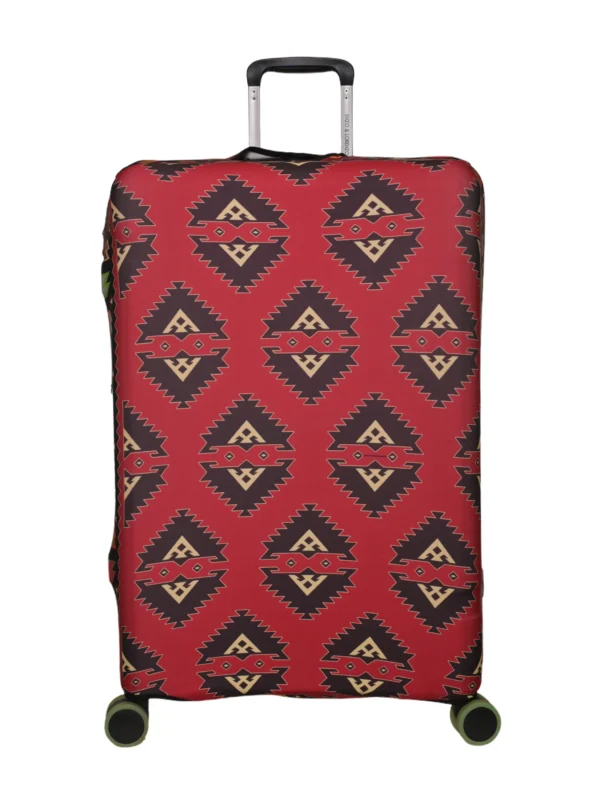 This cover is designed to be easily placed on the suitcase and securely fastened to stay in place during travel. It also features openings for handles and wheels, allowing for easy use and handling of the suitcase even when the cover is on.