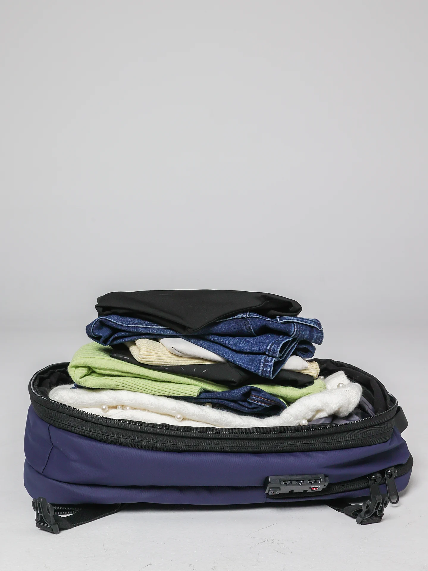 Thanks to an advanced vacuum compression system, this travel backpack reduces the volume of clothing by up to 50%, allowing for the packing of more than 25 outfits, while maintaining dimensions adapted to aeroplane cabins and low-cost airlines such as WizzAir, Ryanair, and EasyJet.